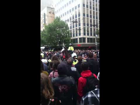 Honestly, police horses are fucking mean. Were I in a protest and a pig carrier was about to chomp off my bits, I'd throw a punch.